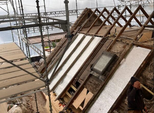 Ved udskiftning af tag på denne bygning skulle der også opgraderes på isoleringen. Her blev Aluthermo Quattro valgt, fordi den tynde opbygning gjorde det muligt at opfylde byggereglementets krav uden at ændre den indvendige loftkonstruktion. En effektiv og skånsom løsning med minimal indgriben.